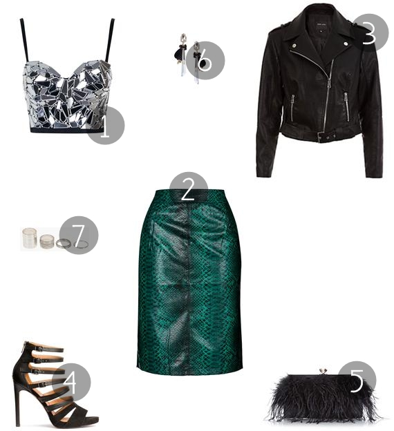 Esta sugestão já é um pouco mais ousada e arrojada, perfeita para quem adora ser irreverente. A conjugar com o bustier juntei uma saia em imitação de pele de cobra em verde (que, a meu ver, é uma das peças-chave do look), um blusão biker em pele sintética em preto e umas sandálias de tiras em preto. Para complementar, acessórios metalizados e uma clutch com franjas de pelo sintético (duas tendências numa só peça).