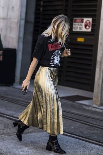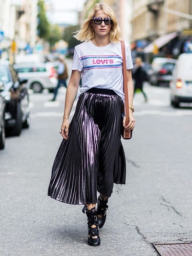 Para usar na perfeição esta tendência, opte por uma midi skirt com plissado e em tons metálicos. Poderá combiná-la com peças mais clássicas para um look elegante e festivo ou com peças mais "rockeiras" e desportivas para um outfit casual.