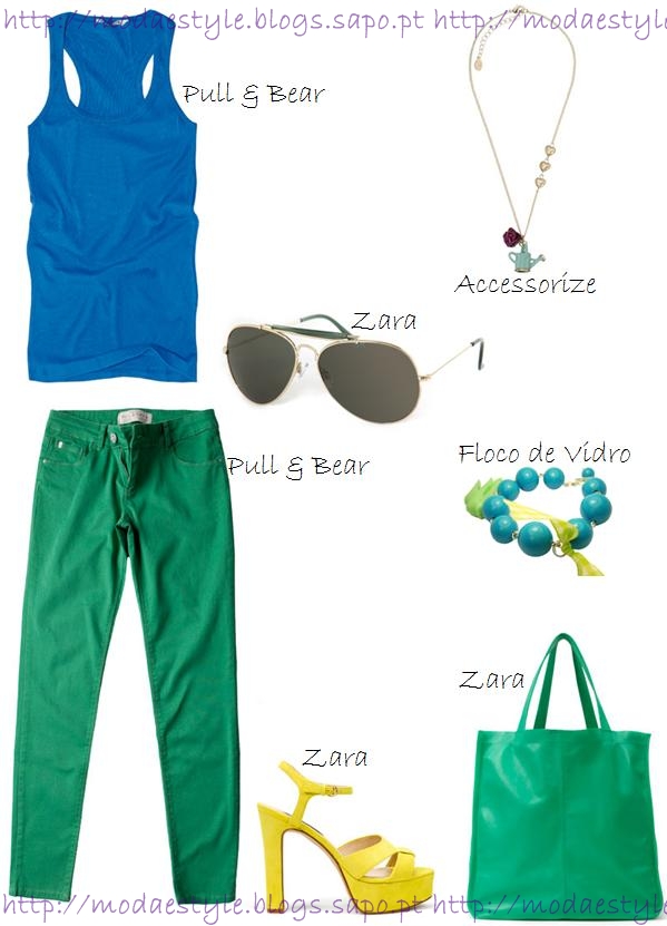 Este look é composto por um top básico em azul mais escuro, contrastando com umas skinny jeans em verde. Em verde também é a mala de alças básica. Para o calçado decidi escolher umas sandálias amarelas para destoar o look. Os acessórios baseiam-se numa bracelete em azul, nuns óculos tipo aviador e um colar com um regador, muito engraçado.