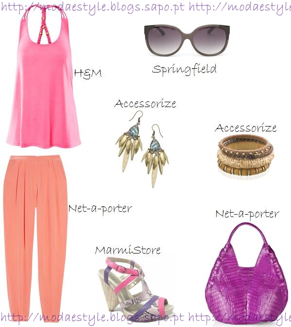 Por fim, este look tem como base o laranja, o lilás e o cor-de-rosa. O top é básico, em cor-de-rosa que contrasta com umas calças tipo saruel em laranja. Para acessórios, um conjunto de bangles em castanho/madeira, uns brincos compridos em dourado e uns óculos tipo gata com a armação em cinza. Para o calçado escolhi umas sandálias com tiras em cor-de-rosa, em lilás e em padrão de cobra. A mala, é de ombro em lilás.