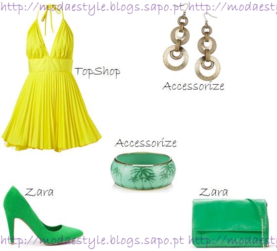 Um look em tons de verde e amarelo, cores mesmas que fazem lembrar a bandeira do Brasil. O vestido é tipo babydoll em amarelo que contrasta com uns sapatos em verde. Em verde também a clutch XXL, outra grande tendência desta estação. Os brincos são compridos em formas circulares em dourado. Para finalizar, uma bangle em verde com uma estampagem tropical que não foi escolhida ao acaso para este look, dando uma sensação de férias, um ar tropical ao look.