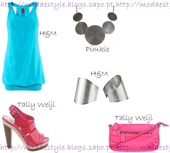 Um look com um acabamento muito urbano. O vestido é básico de alças em azul forte contrastando com umas sandálias tipo gladiador de salto alto em cor-de-rosa choque. A mala à tiracolo pequena também é em cor-de-rosa choque. Para acessórios, duas bangles metalizadas em prateado e um colar maxi (outra grande tendência) metalizado em prateado também.