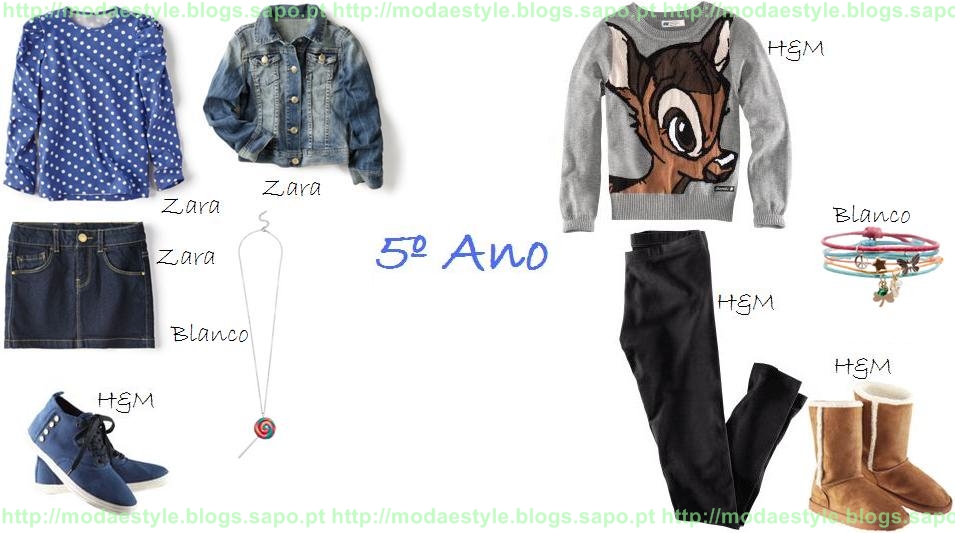 Do 4º para o 5º ano nota-se alguma diferença a nível de cores, sendo mais diversificada, a nível do tipo de vestuário também é variado mas o ideal continua a ser dar aquele ar de "menina". Usa e abusa de cores claras, das camisolas com desenhos, etc. Fiz 2 looks diferentes um do outro: o 1º look é para as meninas que gostam de saias (se quiseres podes substituir por um vestido) e o 2º look para as que não pareciam saias/vestidos. Claro que o calçado, camisolas e agasalhos depende do estado de tempo. Se estiver quente e bom tempo, aproveita e usa t-shirts, se não, estes acho que são adequados.