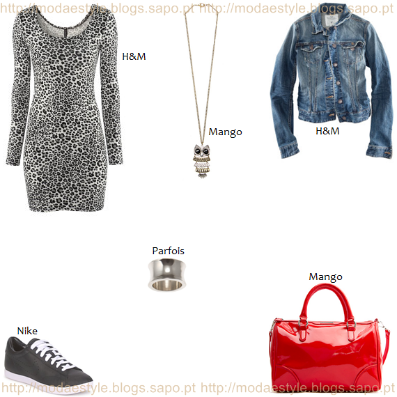 Por fim, atrevo-me a dizer que este look é um bocadinho mais selvagem e com mais influências rockeiras que os restantes. Para começar, o vestido é num padrão leopardo em tons de cinzento/branco. As sapatilhas são de cano baixo em preto, para dar conforto ás minhas leitoras neste look. Os acessórios são sóbrios também: um anel prateado simples e um colar com um pendente em forma de mocho em prateado também.