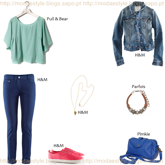 A camisola é em verde água, muito linda que contrasta com umas skinny pants em azul escuro. Escolhi umas sapatilhas de pano em vermelho, que já cria contraste com a camisola. Nos acessórios escolhi uma pulseira com vários pendentes, um colar simples em dourado e a mala que escolhi foi em tons de azul eléctrico, para contrastar com a camisola e as sapatilhas. Acho que até nem fica muito mal, que acham?