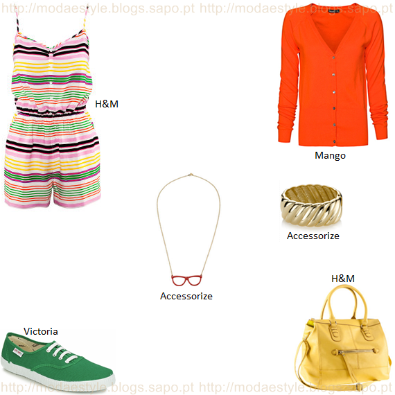 Por fim, este look é totalmente diferente de todos os outros. É constituído por um macacão de riscas horizontais de várias cores. Decidi criar um color block com as sapatilhas, a mala e o cardigan, que estão presentes no macacão.