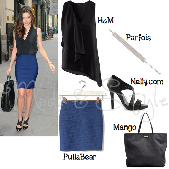 Começo por dizer que alterei algumas peças no look. Por exemplo, em vez de uma camisa cabeada básica, decidi juntar uma blusa cabeada com folhos e assimetria em preto, troquei a pencil skirt em azul eléctrico por uma mini saia detalhada em azul eléctrico, substitui os sapatos com tiras fechados por umas sandálias de tiras. Claro, para uma ocasião de trabalho de secretariado, por exemplo, há que ter limites e usar uma saia mais comprida, mais ou menos como a que a Miranda usa originalmente.