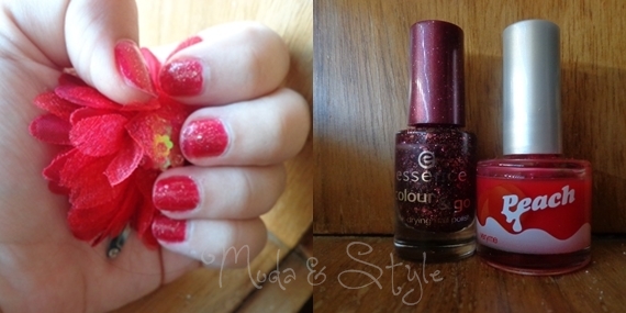 Esta semana inicialmente tinha pintado apenas com o verniz Peach da gama Very Me da Oriflame (review aqui), porém, eu achei que devia dar um ar mais renovado e para tal, escolhi este verniz com glitters da Essence que já tinha comprado por 1,49€ já à algum tempo. Adoro-o, acho super fofinho e dá logo ou outro ar ao verniz vermelho! Tenho de ver se compro o azul e o dourado, fiquei completamente fã deles :)