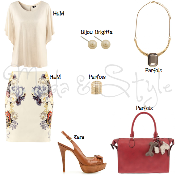 Para terminar esta sugestão de looks, decidi criar um com saltos altos, para aquelas leitoras que desejam ter e adoram andar nas alturas. A blusa é em bege, assim como a saia mas com a diferença de ser florida, logo, dá uma outra vida no resultado final. Os acessórios neste caso são mais delicados, por exemplo, o colar é em dourado com uma pedra no pendente e uns brincos a imitar pérolas em tons de bege também. O único acessório simples é o anel dourado. Decidi criar contraste entre os sapatos e a carteira, sendo os primeiros em castanho e o último item em vermelho.