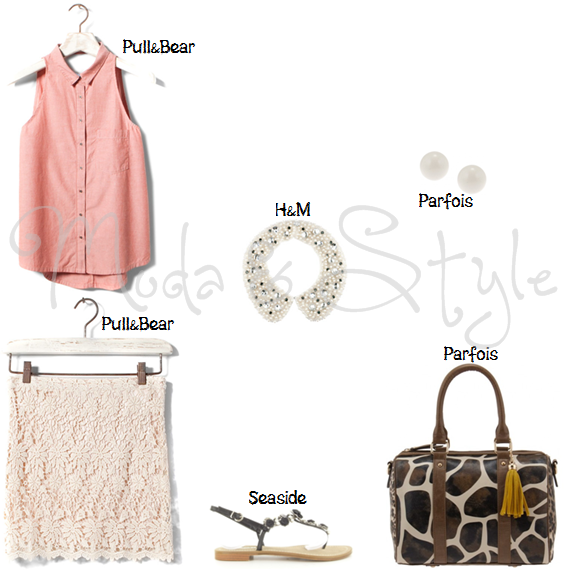 Como sei que nem todas as leitoras mais velhas gostam de usar saltos altos, decidi dar uma sugestão com calçado raso mas que pudesse ser facilmente usado numa situação de trabalho (onde o nível de formalidade não seja elevado ou onde não é exigido). Para contrariar a tendência de conjugar uma saia rendada com top básico, decidi juntar-lhe uma camisa sem mangas em tons de pêssego. Mas para o look não ficar demasiado sem vida, juntei então uns brincos curtos em branco e um colar tipo gola (grande tendência) com alguns brilhantes, também em tons de branco. E agora, para quebrar esta mistura toda de tons claro, as sandálias num tom mais escuro e a mala estampada com tons escuros também.