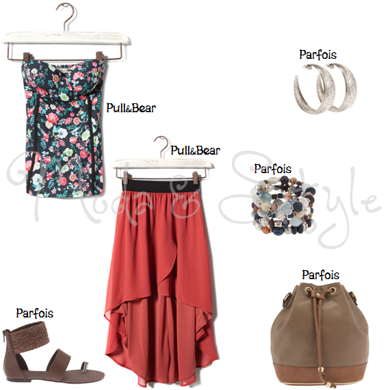 E porque as leitoras mais jovens não podiam ficar de fora, decidi fazer um look prático, moderno mas ao mesmo tempo bonito e adequado agora para o calor, sem esquecer o tom bronzeado que algumas já devem de ter. Então, neste caso é uma saia assimétrica em tons de vermelho (adoro-a... é linda!), que dá vivacidade ao corpete de fundo preto com estampado floral. Quanto ao calçado, nada melhor que uma sandálias trabalhadas com ráfia e em tons de castanho, assim como uma pequena mala em tons de toupeira. Como qualquer look, é necessário acessórios, então para os braços não ficarem destapados, decidi juntar uma pulseira em espiral e para adornar as orelhas umas argolas étnicas em prateado.
