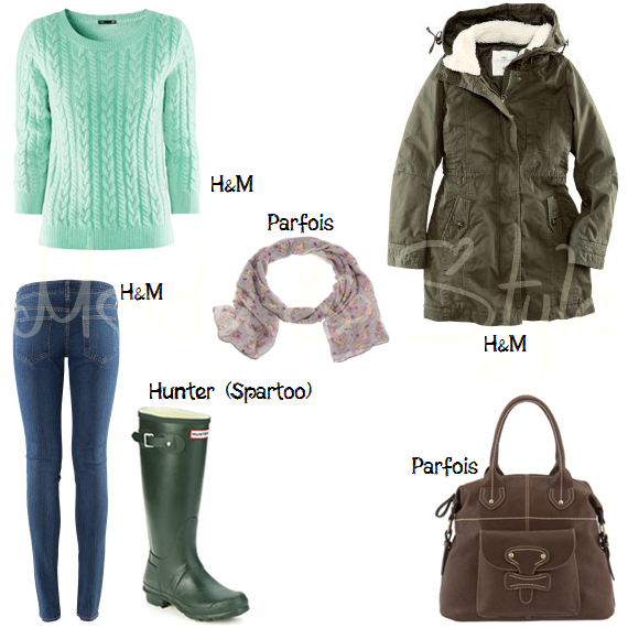 Este sem dúvida que é um look muito mais simples mas que nunca deixa de perder o estilo. Foquei numa cor que gosto imenso, o verde, tendo aqui presentes três tonalidades do mesmo: o menta (da camisola), o verde tropa (da parka) e o verde garrafa (das galochas). Optei por escolher uma mala castanho e apenas um lenço florido como acessórios, pois creio que nestes dias a vontade de usar acessórios é pouca, mas mesmo assim se quiserem, optem por usar um anel ou até mesmo uns brincos, fica sempre bem.