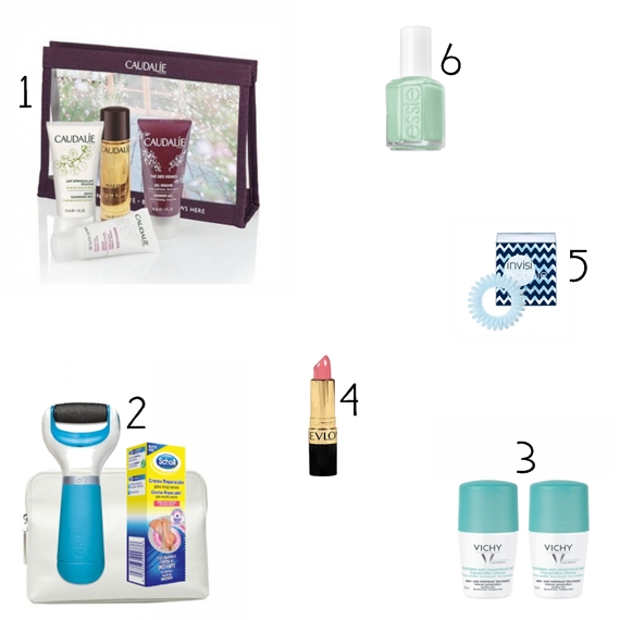 1. Bolsa de Verão Caudalie 2. Pack Lima Eletrónica + Creme Reparador Dr. Scholl 3. Pack Desodorizante Transpiração Intensa Vichy 4. Superlustrous Lipstick Revlon 5. Wild Whisper Fata Morgana Invisibobble 6. Mint Candy Apple Essie