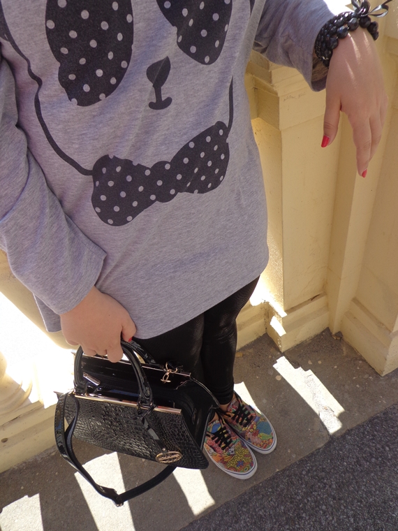 Ora como conforto para mim são as sapatilhas, decidi calçar as minhas amadas Vans, que são as primeiras por sinal que tenho. Amo-as pelo seu padrão tão diferente e louco! Aliás, quase toda a gente que as viu adora-as. Para terminar, nada melhor do que a minha nova aquisição, a primeira mala preta pela qual me apaixonei. É tão mas tão versátil! Muito mais do que possam imaginar. Sempre que posso, levo-a comigo para todo e qualquer lado... Eu e a minha mãe, porque ela também amou-a à primeira vista. Está mais de que visto que somos mãe e filha!