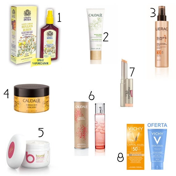 1. Loção Reflexos Louros 2. Máscara Facial Hidratante 3. Spray Corporal 4. Exfoliante Corporal 5. Creme Gordo 6. Água Fresca 7. Hidratante Labial 8. Protetor Solar